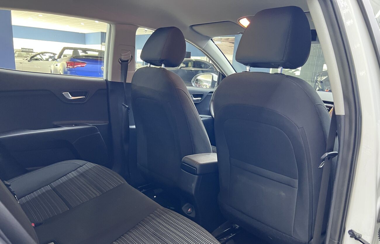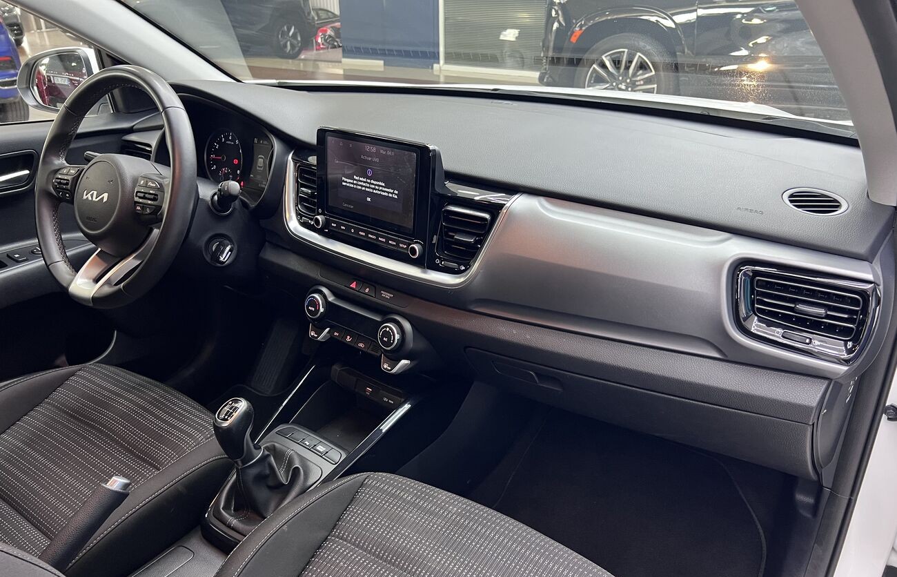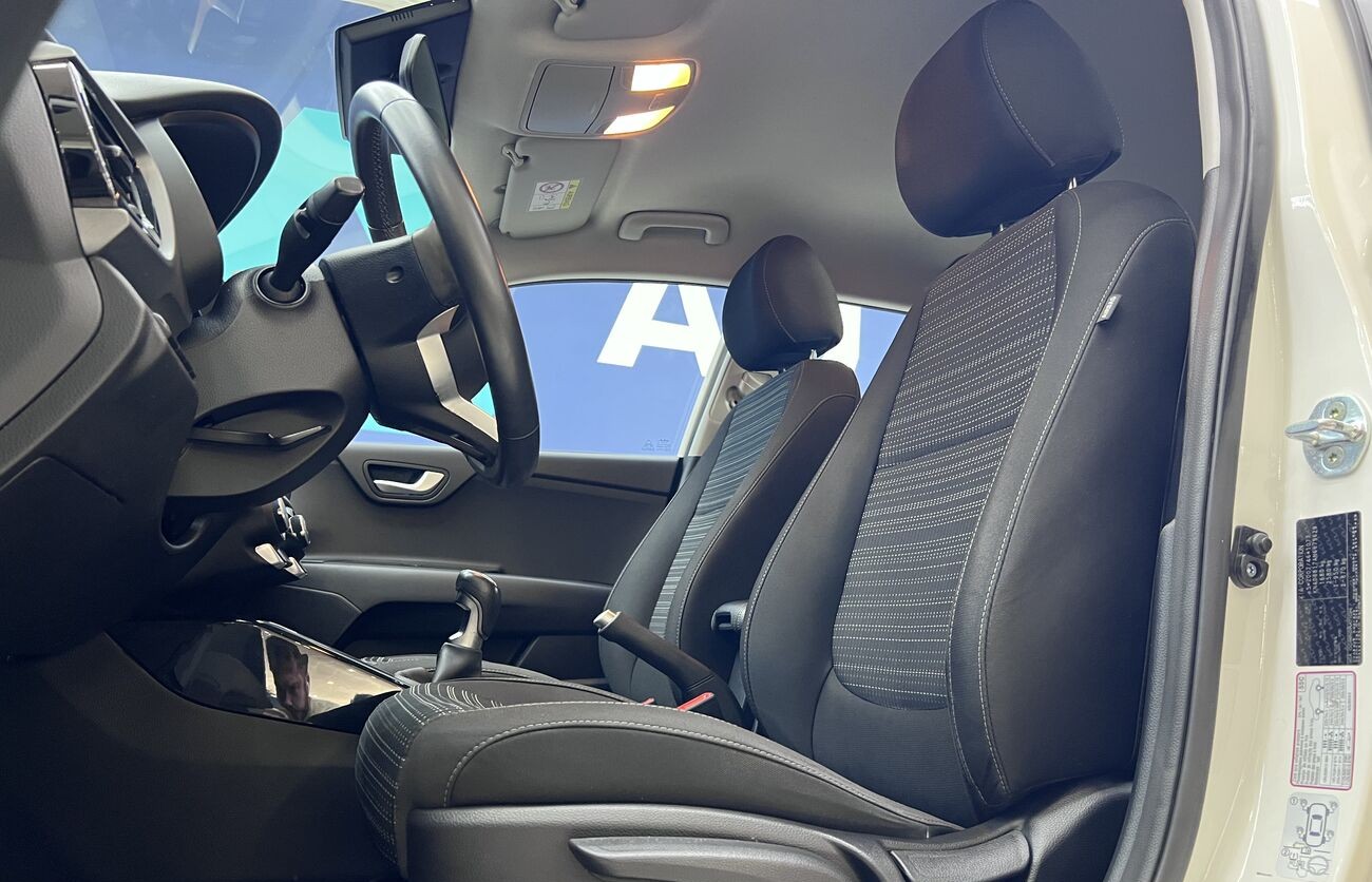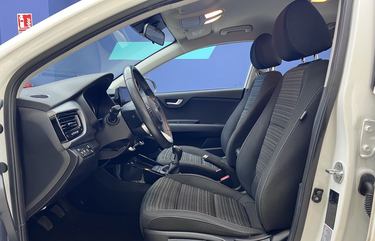 Kia Rio / Stonic – Un crossover/hatchback compacto y moderno para Europa, blanco, con motor de gasolina y caja manual. Económico, agradable en ciudad, cómodo para el uso diario. Tiene sistemas de seguridad modernos, asistentes, multimedia, cámara, climatización. Interior en tela, maletero práctico, buen conjunto de funciones básicas.