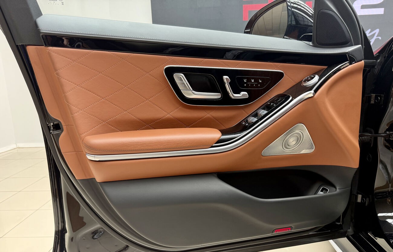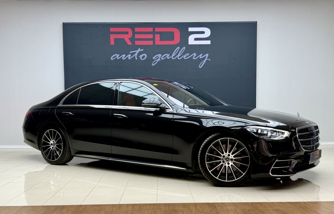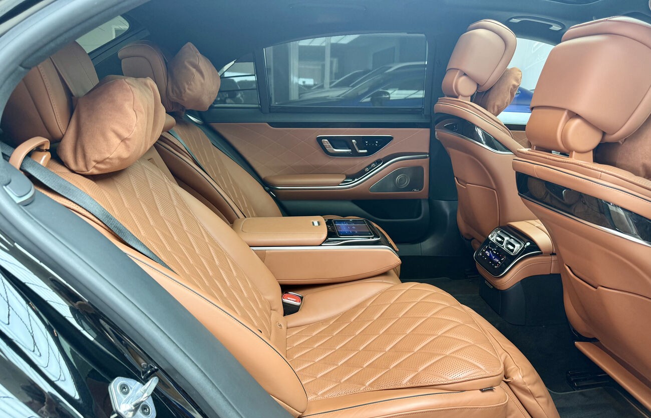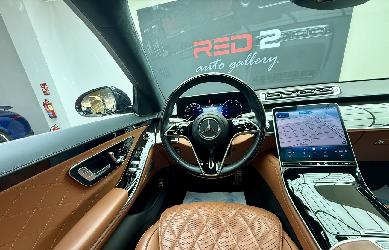Mercedes-Benz S 400d 4MATIC Larga-vehículo de lujo, berlina larga con tracción total 4MATIC, motor diésel OM656 2,9 L. Combina confort, seguridad y tecnología avanzada, ideal para viajes largos con interior exclusivo de color naranja máximo.